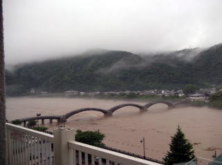ホテルの前の錦帯橋。みるみるうちに水かさが増してきて、ものすごい濁流。怖い・・・・・・。