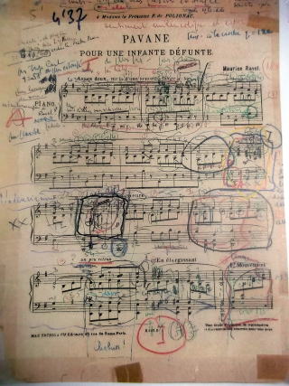 生徒さんが、ラヴェル「亡き王女のためのパヴァーヌ」の楽譜をコピーして持って来てくれました。ペルルミュテールさんが校訂した版(音友)から、です。