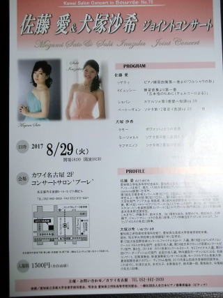 8月29日(火)開演18:30カワイ名古屋2Fコンサートサロン’ブーレ’で、元門下生の佐藤愛さんがジョイントコンサートに出演されます。