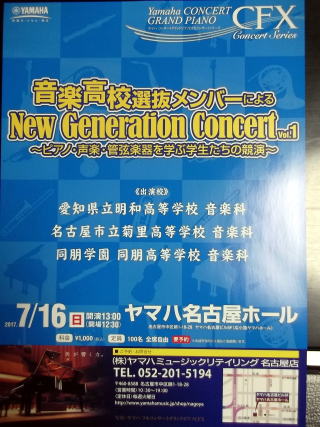 7月16日(日)開演13:00ヤマハ名古屋ホールで、音楽高校選抜メンバーによる「New Generation Concert Vol.1」が開催されます。