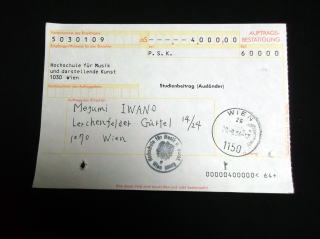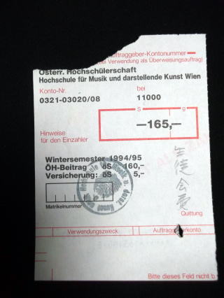 ←ウィーン国立音大の授業料は、1年間で、8万円かかります。(夏学期ゾンマーゼメスターに4000シリング、冬学期ヴィンターゼメスターに4000シリングで、日本円にすると、1年間で8万円くらいです)。