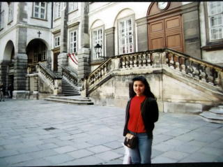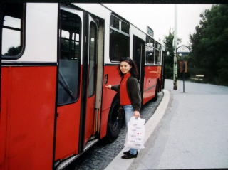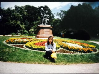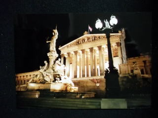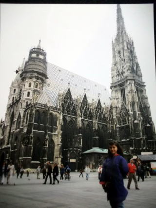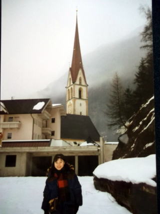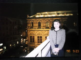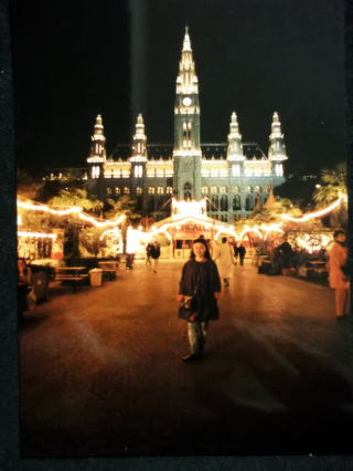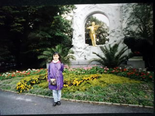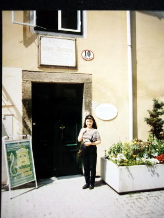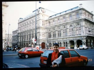 ←ウィーン国立オペラ座前で。22歳の私。9月23日ですが、赤いカシミヤのセーターに黒いジャンパーを着てやはり、日本と違い、寒い国です。音大の入試の5日前に、初めて、ウィーンに入りました。最初の印象は、「お部屋が暗い!」どこもかしこも、暗い。