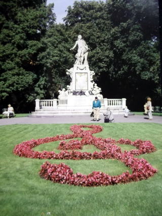←ブルグ公園にある、モーツァルトの像。季節の花で、ト音記号が鮮やかに彩られます。