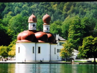 ←赤いネギ坊主の聖バルトロメー僧院。ここの前に、ケーニッヒスゼー(ケーニッヒ湖)があり、遊覧船に乗れます。