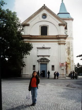 ←カーレンベルクの丘近くのレオポルツベルク教会の前で。