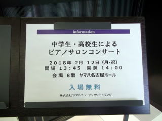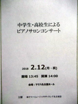 ←来る、2018年2月12日(月・祝)開場13:45開演14:00ヤマハ名古屋ホールで、「中学生・高校生によるピアノサロンコンサート」が開催されます。