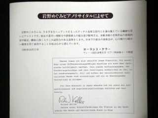 「岩野めぐみさんは、非常に繊細な感受性をもった芸術家です。彼女のピアノ演奏における完成した意志の表現は、並外れた感嘆すべき演奏技術に伴われておりますが、それは