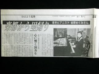 ←1996年4月5日(金)毎日新聞朝刊記事掲載「楽都から里帰り」若手ピアニスト 岩野めぐみさん