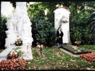 ←ウィーン中央墓地。頭を抱えて悩んでいるブラームスのお墓の前で。左側が、ヨハンシュトラウスのお墓です。