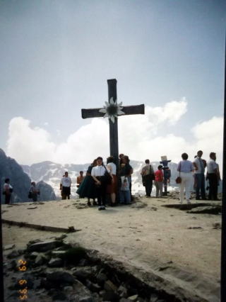 ←オーストリアの国花「エーデルワイス」の十字架の前で。ドイツ、ベルヒテスガーデンの山の頂上へ行くと、小さな愛らしいエーデルワイスが沢山咲いています。