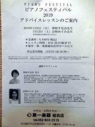 ←2019年1月12日(土)第一楽器植田店3Fホールで、ピアノフェスティバル2019アドバイスレッスンがあります。