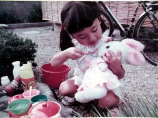 ←「はい、いまから、ごはんたべましょうね~」5歳の頃の私。自宅のお庭で、おままごとをしています。
