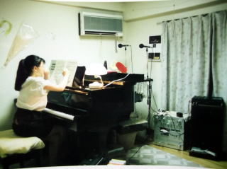 ←寮の私のピアノ練習室で。何と、2畳半です!グランドピアノG2を入れたら、きゅうきゅうです。