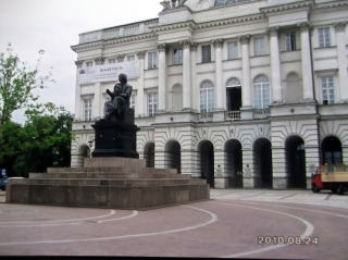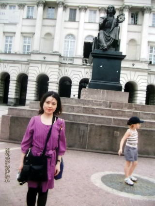 ←ポーランド、ワルシャワにある、天文学者コペルニクスの像の前で。