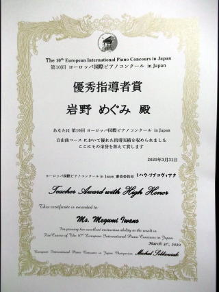 第10回ヨーロッパ国際ピアノコンクールin Japanから、賞状が送られてきました。