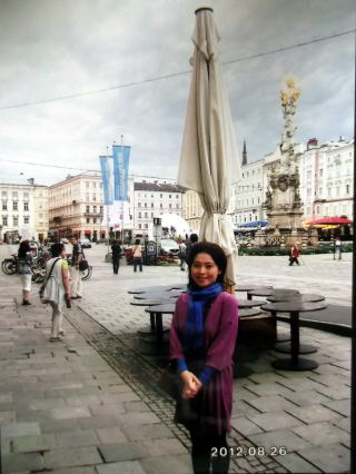 ←オーストリア、リンツのハウプト広場で。ここにも三位一体のペストの塔があります。