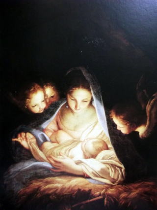 幼子イエスキリストを藁の上に横たえる聖母マリア様の周りに、