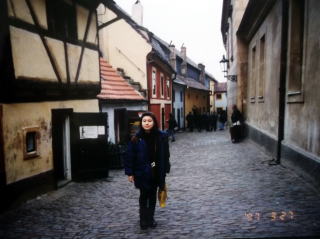 ←プラハのフランツ・カフカの生家がある、「黄金小路」で。留学当時の私。