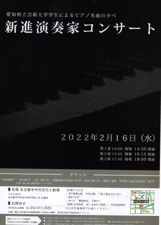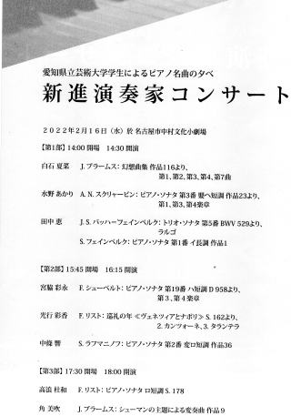 ←来月2月16日(水)中村文化小劇場で、愛知県立芸術大学学生によるピアノ名曲の夕べ「新進演奏家コンサート」が開催されます。