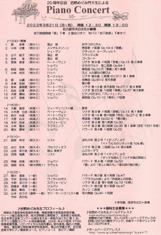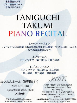 ←今月3月31日(木)めいおんホールの博門館4Fで、名古屋音楽大学ピアノ演奏家コースの学内リサイタルが開催されます。
