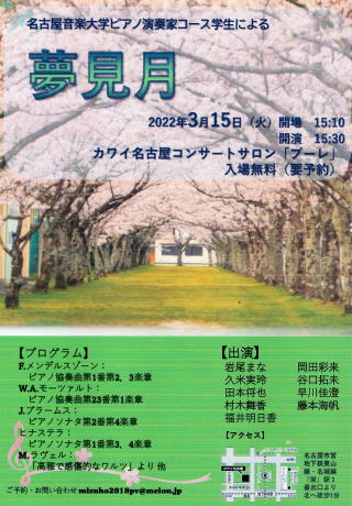 ←又、3月15日(火)には、カワイ名古屋コンサートサロン「ブーレ」で、名音大のピアノ演奏家コース学生による「夢見月」があります。
