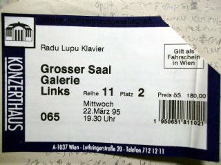 ←1995年3月22日ウィーンのコンツェルトハウスで聴いたラドゥ・ルプーのピアノリサイタルのチケット。