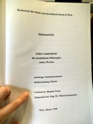 私は、ウィーンでは外国人なので、やはり、テーマにするなら、日本のものがいいと思い、日本人の作曲家、武満徹さんを選んで修士論文を書きました。