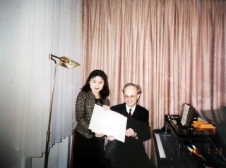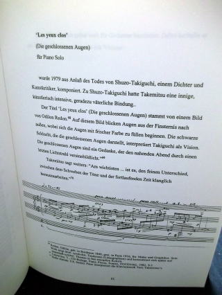 文中に出てくる、例えば、日本の楽器の尺八や、琵琶などの楽器の説明や、文中に登場してくる人物等全て辞書で調べドイツ語に直し、武満さんのオーケストラの曲の分析6曲とピアノ曲2曲の譜面をすみずみまで研究し、日本語で書き、又、ドイツ語に直して、と気の遠くなるような日々が続き、しまいには、シュテファニーデス先生も真っ赤な顔をされて机をたたいてお怒りになられるし、私は何度となくくじけそうになっていた。