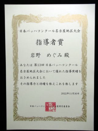 ←生徒の皆様が熱心に頑張って下さったお陰で、第13回日本バッハコンクールの指導者賞を頂きました。