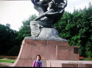 ←ジェラゾヴァ・ヴォラにあるショパンの生家の前で。
