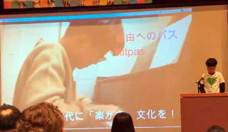 ←大阪で、キットパスのプレゼンをする小学5年生の前田暁映君。