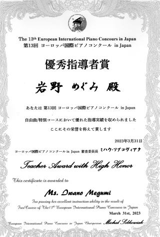 ←第13回ヨーロッパ国際ピアノコンクール in Japanの自由曲コース/特別コースにおいて、優秀指導者賞を頂きました。
