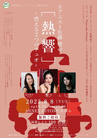 8月8日(火)HITOMIホール19時開演 ピアニスト佐藤愛の「熱響」~燃える2つのデュオ~が開催されます。