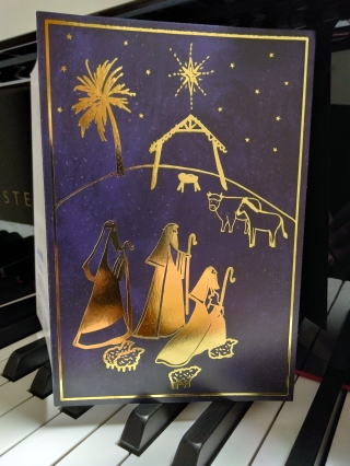 イエス・キリストが飼い葉おけで生まれた時に周りにいる羊や、馬や、色々描かれたドイツらしい素敵なカードですね。