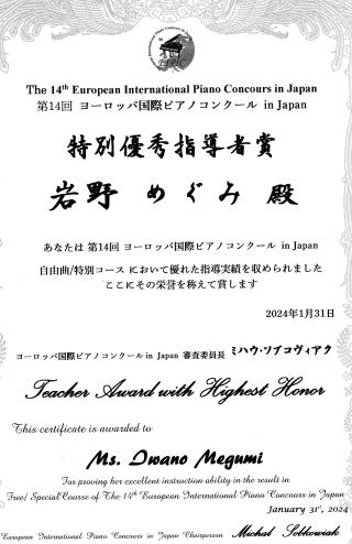 第14回ヨーロッパ国際ピアノコンクールin Japan自由曲/特別コースにおいて