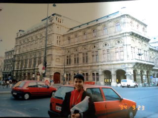ウィーンに到着して、まだ、時差ボケの私、ウィーン国立歌劇場前で。