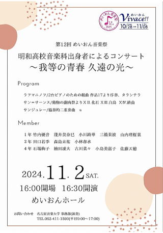 ←明日、11月2日(土)16:00開場、16:30開演 明和高校音楽科出身者によるコンサートが名古屋音楽大学のめいおんホールで開催されます。