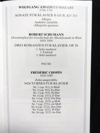 初めにシューマンの3つのロマンス、モーツァルトのソナタKV.333、ショパンノクターンNr.1~10まで、アンコールが13番のc-moll。