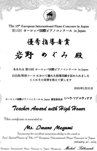 令和7年2月9日(日)第15回日本バッハコンクール全国大会一般B部門金賞受賞