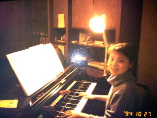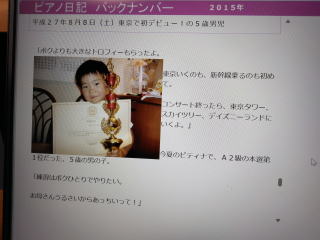 ←私の過去の日記にも何度か登場して下さっていますので、ご存じの方もいらっしゃるかとは思いますが、左の写真は、私が見させて頂いた5歳の頃、PTNAのA2級の本選第1位を頂いて、私のレッスン室の前で、撮った写真です。